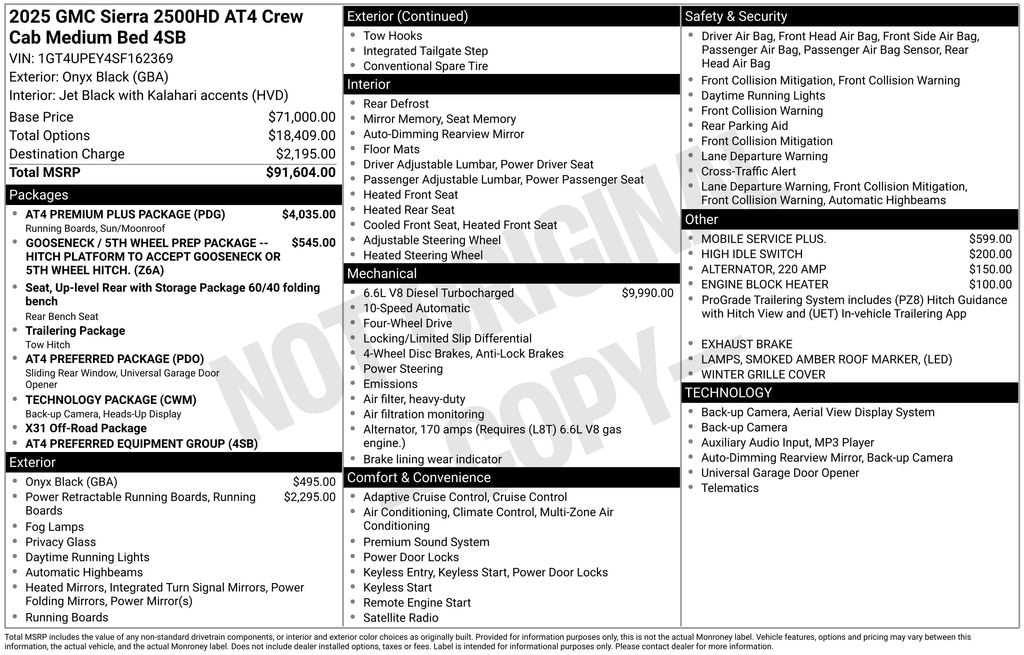 Recent Arrival! Clean CARFAX. Onyx Black 2025 GMC Sierra 2500HD AT4 Duramax 6.6L V8 Turbodiesel 10-Speed Automatic 4WD 4D Crew Cab 10-Speed Automatic, 4WD, Jet Black With Kalahari Accents Leather, 10-Way Power Driver Seat Adjuster w/Lumbar, 10-Way Power Passenger Seat Adjuster w/Lumbar, 120-Volt Bed Mounted Power Outlet, 120-Volt Instrument Panel Power Outlet, 2 Charge-Only Rear USB Ports, 2 Charge/Data USB Ports Inside Center Console, 2 USB Ports, 2-Speed Active Transfer Case, 220-Amp Alternator, 4-Wheel Disc Brakes, 7 Speakers, ABS brakes, Air Conditioning, Alloy wheels, AM/FM radio: SiriusXM with 360L, Apple CarPlay/Android Auto, AT4 Preferred Package, AT4 Premium Plus Package, Auto High-beam Headlights, Auto-dimming door mirrors, Auto-dimming Rear-View mirror, Automatic Emergency Braking, Automatic temperature control, Bed View Camera w/2 Trailer Camera Provisions, Bose Premium 7-Speaker Sound System, Brake assist, Buckle to Drive, Bumpers: body-color, Compass, Deep-Tinted Glass, Delay-off headlights, Driver door bin, Driver Memory, Driver vanity mirror, Dual front impact airbags, Dual front side impact airbags, Electric Rear-Window Defogger, Electronic Stability Control, Emergency communication system: OnStar, Engine Block Heater, Exhaust Brake, Floor-Mounted Center Console, Following Distance Indicator, Forward Collision Alert, Front anti-roll bar, Front Bucket Seats, Front Center Armrest, Front dual zone A/C, Front fog lights, Front Pedestrian Braking, Front Prem Floor Liners w/Removable Carpet Insert, Front Rain-Sensing Wipers, Front reading lights, Front wheel independent suspension, Fully automatic headlights, Gloss Black Header Grille & Grille Insert Bars, Gooseneck/5th Wheel Prep Package, HD Surround Vision, Heated 2nd Row Outboard Seats, Heated door mirrors, Heated Driver & Front Outboard Passenger Seats, Heated front seats, Heated rear seats, Heated steering wheel, Heavy-Duty 80 Amp Battery, High Idle Switch, Hill Descent Control, Hitch Guidance w/Hitch View, Illuminated entry, In-Vehicle Trailering System App, Inside Rearview Auto-Dimming Rear Camera Mirror, IntelliBeam Automatic High Beam On/Off, Keyless Open & Start, Lane Departure Warning System, LED Cargo Area Lighting, LED Smoked Amber Roof Marker Lamps, Low tire pressure warning, Manual Tilt-Wheel/Telescoping Steering Column, Memory seat, Mobile Service Plus, Multicolor 15" Diagonal Head-Up Display, Occupant sensing airbag, Off-Road High Clearance Step (LPO), Off-Road Suspension, OnStar Services Capable, Outside temperature display, Overhead airbag, Overhead console, Panic alarm, Passenger door bin, Passenger vanity mirror, Perforated Leather-Appointed Front Seat Trim, Pickup Box, Power door mirrors, Power driver seat, Power Front Passenger Windows w/Express Up/Down, Power passenger seat, Power Sliding Rear Window w/Defogger, Power steering, Power Sunroof, Power windows, Power-Retractable Black Assist Steps, Preferred Equipment Group 4SB, Push Button Start, Radio: AM/FM w/Premium GMC Infotainment System, Rain sensing wipers, Rear Cross Traffic Alert, Rear Prem Floor Liners w/Removable Carpet Insert, Rear reading lights, Rear seat center armrest, Rear step bumper, Rear Wheelhouse Liners, Rear window defroster, Remote keyless entry, Remote Vehicle Starter System, Safety Alert Seat, Security system, SiriusXM w/360L Trial Subscription, Speed control, Speed-sensing steering, Split folding rear seat, Spray-On Pickup Bedliner w/GMC Logo, Steering Wheel Audio Controls, Steering wheel mounted audio controls, Tachometer, Technology Package, Telescoping steering wheel, Tilt steering wheel, Traction control, Trailer Cam Provisions & Trailer Viewing Software, Trailer Side Blind Zone Alert, Trip computer, Turn signal indicator mirrors, Ultrasonic Front & Rear Park Assist, Unauthorized Entry Theft-Deterrent System, Universal Home Remote, Variably intermittent wipers, Ventilated Driver & Front Passenger Seats, Ventilated front seats, Voltmeter, Wheels: 20" High Gloss Blac