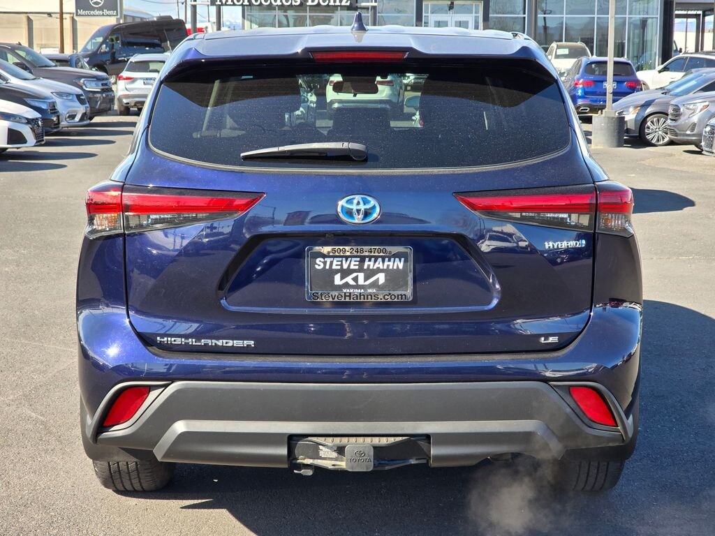 CARFAX One-Owner. Blue 2021 Toyota Highlander Hybrid LE 2.5L I4 PDI Hybrid DOHC 16V LEV3-SULEV30 186hp eCVT AWD 4D Sport Utility 2.5L I4 PDI Hybrid DOHC 16V LEV3-SULEV30 186hp, 18" Painted Alloy Wheels, 3rd row seats: split-bench, 4-Wheel Disc Brakes, 6 Speakers, ABS brakes, Air Conditioning, Alloy wheels, AM/FM radio: SiriusXM, Apple CarPlay/Android Auto, Auto High-beam Headlights, Automatic temperature control, Axle Ratio TBD, Brake assist, Bumpers: body-color, Delay-off headlights, Driver door bin, Driver vanity mirror, Dual front impact airbags, Dual front side impact airbags, Electronic Stability Control, Emergency communication system: Safety Connect with 1-year trial, Exterior Parking Camera Rear, Fabric Seat Trim, Four wheel independent suspension, Front anti-roll bar, Front Bucket Seats, Front Center Armrest, Front dual zone A/C, Front fog lights, Front reading lights, Fully automatic headlights, Heated door mirrors, Illuminated entry, Knee airbag, Leather Shift Knob, Low tire pressure warning, Occupant sensing airbag, Outside temperature display, Overhead airbag, Overhead console, Panic alarm, Passenger door bin, Passenger vanity mirror, Power door mirrors, Power driver seat, Power Liftgate, Power steering, Power windows, Radio: Audio Plus (T1 Hi), Rear air conditioning, Rear anti-roll bar, Rear reading lights, Rear seat center armrest, Rear window defroster, Rear window wiper, Reclining 3rd row seat, Remote keyless entry, Security system, Speed control, Speed-sensing steering, Split folding rear seat, Spoiler, Steering wheel mounted audio controls, Telescoping steering wheel, Tilt steering wheel, Traction control, Trip computer, Turn signal indicator mirrors, Variably intermittent wipers, 2.5L I4 PDI Hybrid DOHC 16V LEV3-SULEV30 186hp.